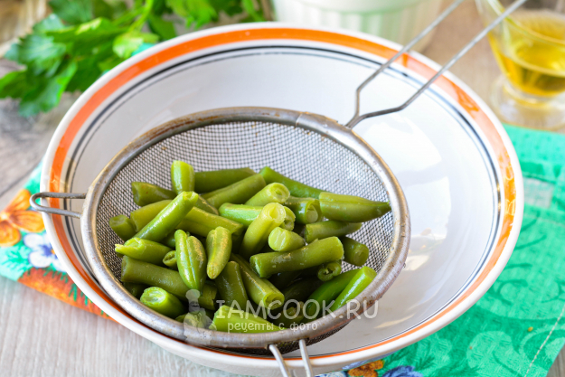Стручковую фасоль бланшируйте в воде 5-7 минут, затем откиньте на сито, чтобы стекла вся жидкость. Для рецепта можно использовать как свежую, так и замороженную стручковую фасоль. Выложите подготовленную остывшую фасоль в миску.
