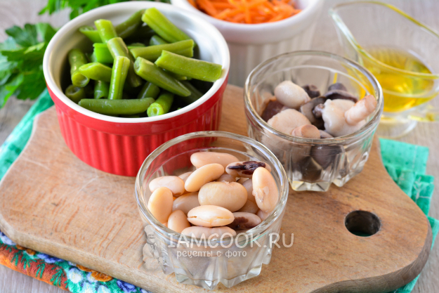 Подготовьте продукты для салата с фасолью, маринованными грибами и корейской морковью.