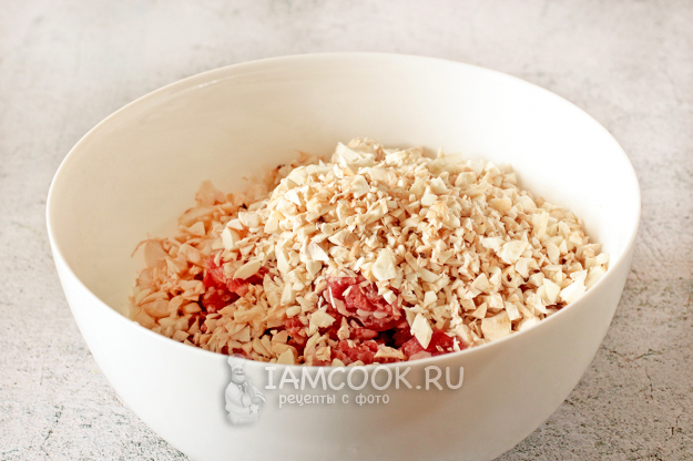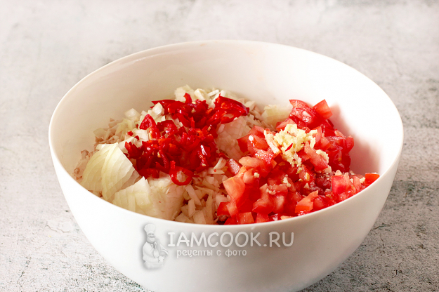В миску добавьте нарезанный мелко лук, давленый чеснок, измельченные помидоры и перец чили. Посолите, посыпьте сушеным чесноком и хорошенько перемешайте фарш.