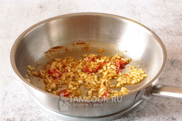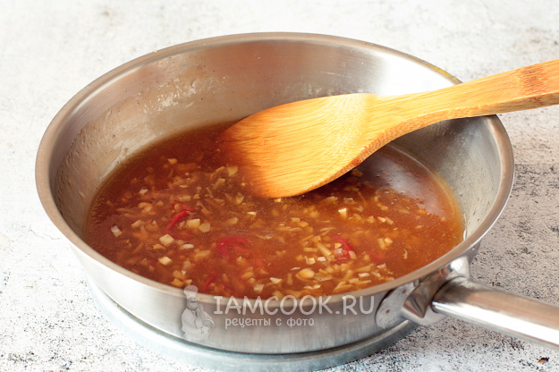 В разогретом кунжутном или оливковом масле поджарьте измельченный имбирь и чеснок с перцем чили.