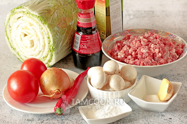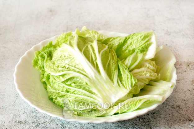 Подготовьте необходимые продукты. У китайской капусты срежьте ту ее часть, где листья сильно утолщаются. Эту часть можно использовать позже для салатов.