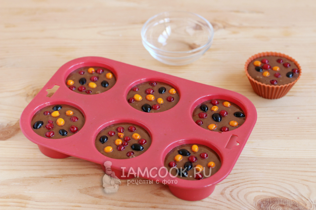 Сверху на тесто в каждую формочку положим ягоды. Если ягоды замороженные, ничего страшного, их предварительно можно не размораживать. Формочки с тестом ставим в разогретую духовку и выпекаем примерно 20-25 минут.