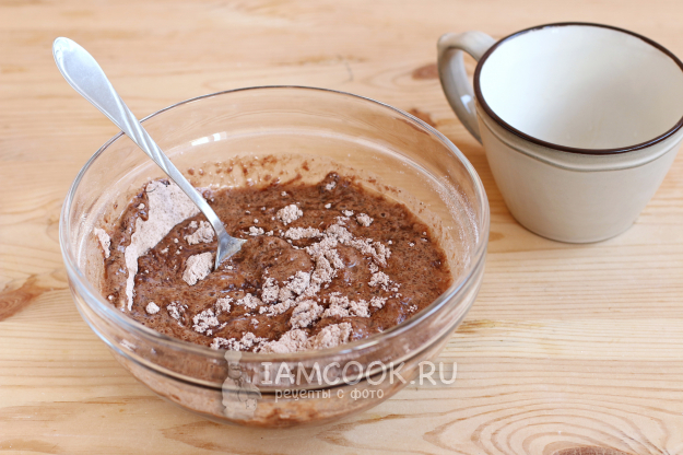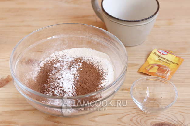 Просеиваем в миску муку, какао, разрыхлитель. Сразу включим духовку и нагреем её до 180 градусов.