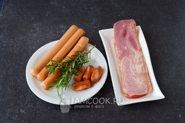 Сегодня готовим сосиски в беконе в духовке. Если нет маленьких сосисок - не проблема, режем длинные на 2-3 части. Нет розмарина - не беда, используем деревянные зубочистки. Кстати, если будете использовать веточки розмарина, имейте в виду, что в процессе запекания листики могут потерять цвет, а то и вообще отпасть. Конечно, в готовой сосиске вкус розмарина внутри ощущается и придает ей дополнительный аромат, но если надо гостей удивить красотой подачи, то есть смысл воткнуть веточки розмарина уже перед самой подачей.