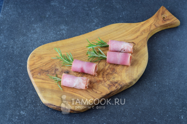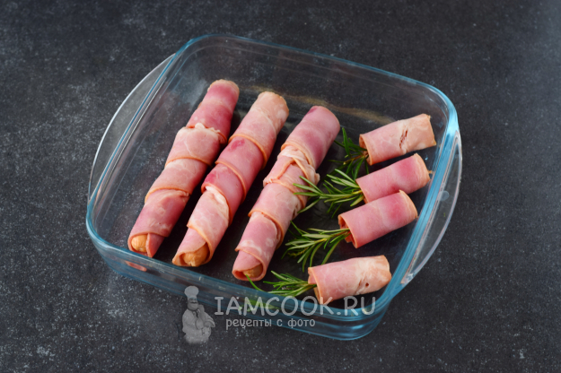 Ну, а теперь быстренько обмотаем каждую сосиску полоской бекона внахлест спиралью, не оставляя пространства между слоями бекона. Можно концы бекона закрепить на сосиске при помощи зубочистки на время запекания, чтобы бекон не сполз с нее.