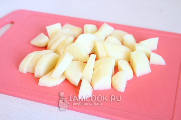 Пока варятся креветки, я успеваю подготовить овощи. Картофель очищаю и крупно нарезаю.