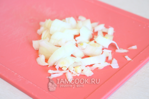 Пока варится крупа, очистим и подготовим овощи. Лук нарезаем небольшим кубиком.