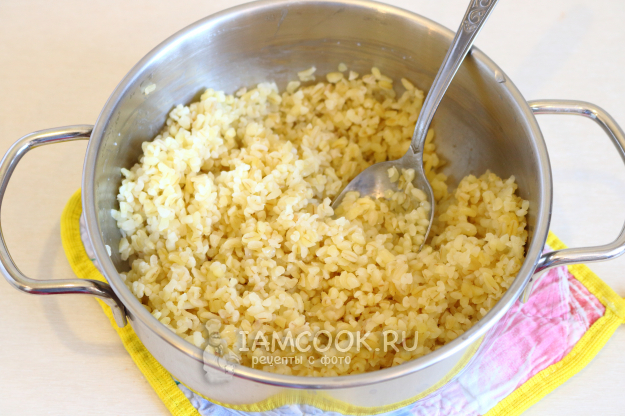 Булгур зальём холодной водой и отварим до готовности на небольшом огне. Это займет 15-20 минут.