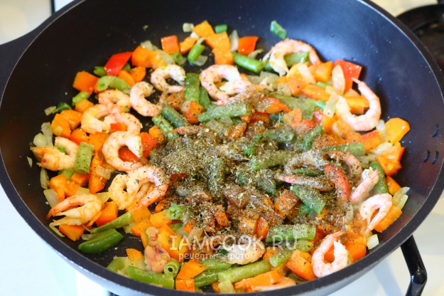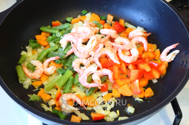 На сковороду выкладываем следующие ингредиенты: стручковую фасоль, болгарский перец и мясо креветок.