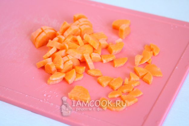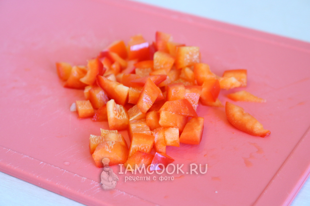 Болгарский перец тем временем нарезаем также небольшим кубиком.