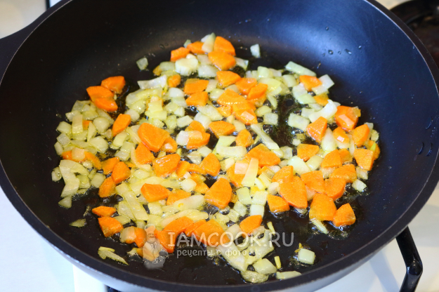 Выкладываем овощи на сковороду, разогретую с маслом, и пассеруем 5 минуточек - до лёгкой золотистости.