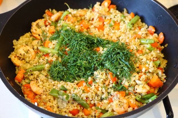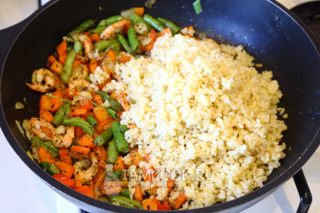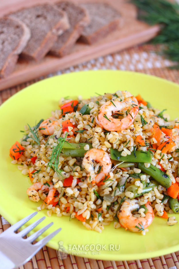 Булгур с креветками и овощами готов! Подаём к столу в горячем виде в качестве основного блюда или в тёплом - как салат. Приятного аппетита!