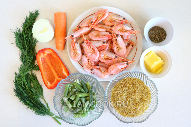 Для приготовления булгура с креветками и овощами нам потребуются следующие ингредиенты.
