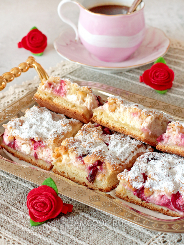 Если тёртый пирог с творогом и вишней разрезать в остывшем виде, то срез получится более красивым и гладким. Я нарезала в горячем виде.