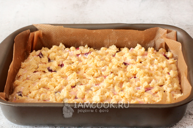 Выложите на дно раскатанное тесто. Поверх разложите творожно-вишневую начинку.