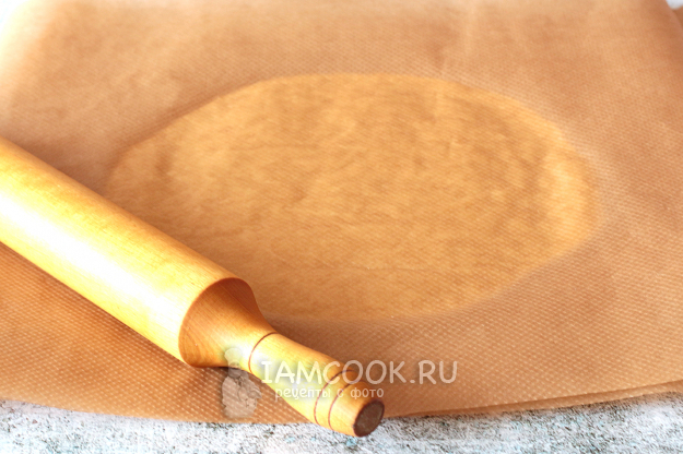 Большую часть теста раскатайте между двумя листами пергамента (так как тесто очень мягкое и слегка липнет) по размеру вашей формы.