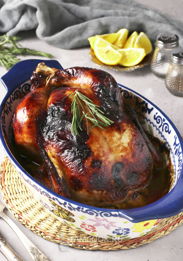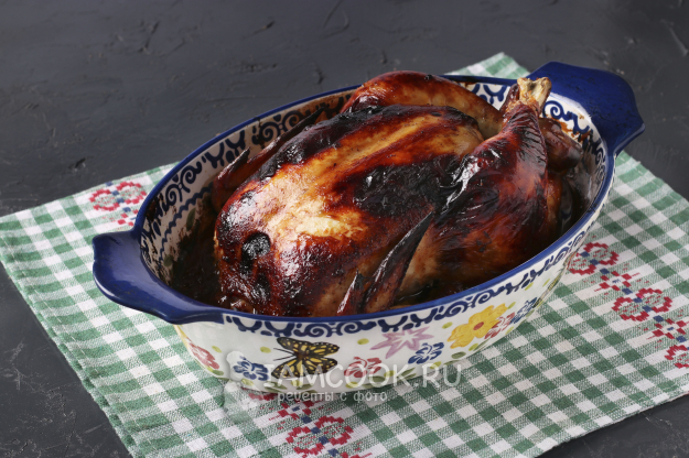 Духовку разогреть до 150 градусов. Форму с курицей накрыть фольгой и запекать курицу 1.5 часа. Если птица больше по весу, то запекать нужно дольше по времени. Через указанное время увеличить температуру духовки до 200 градусов, снять с курицы фольгу, смазать выделившимся соком и запекать до желаемой румяной корочки. Если в духовке есть гриль, можно подрумянить курицу с его помощью.