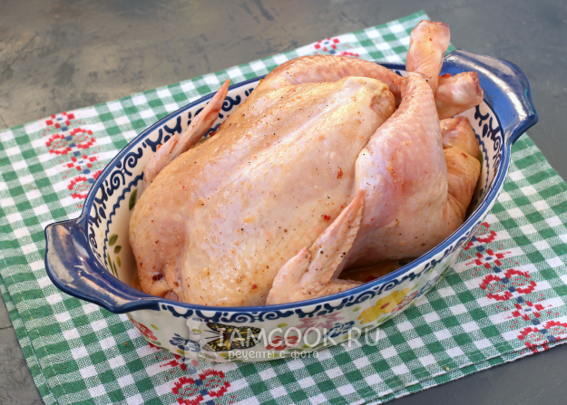 Курицу тщательно промыть внутри и снаружи проточной водой, хорошо обсушить с помощью бумажных полотенец. Удалить лишний жир, если есть, и волоски на коже.