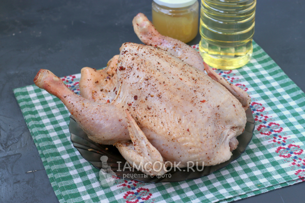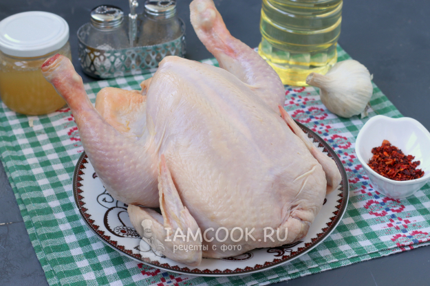 Для приготовления медовой курицы с чесноком в духовке (целиком) подготовить из списка необходимые ингредиенты.