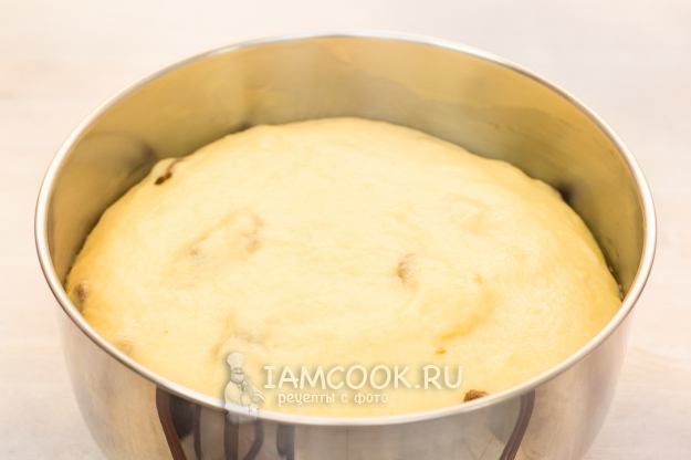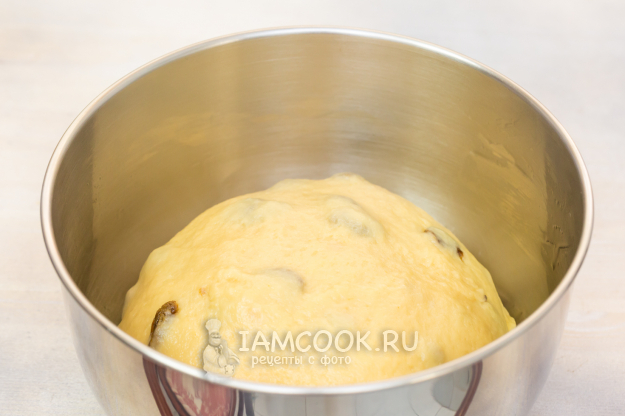 Как только вымесили тесто, добавьте изюм и вмешайте его в тесто.