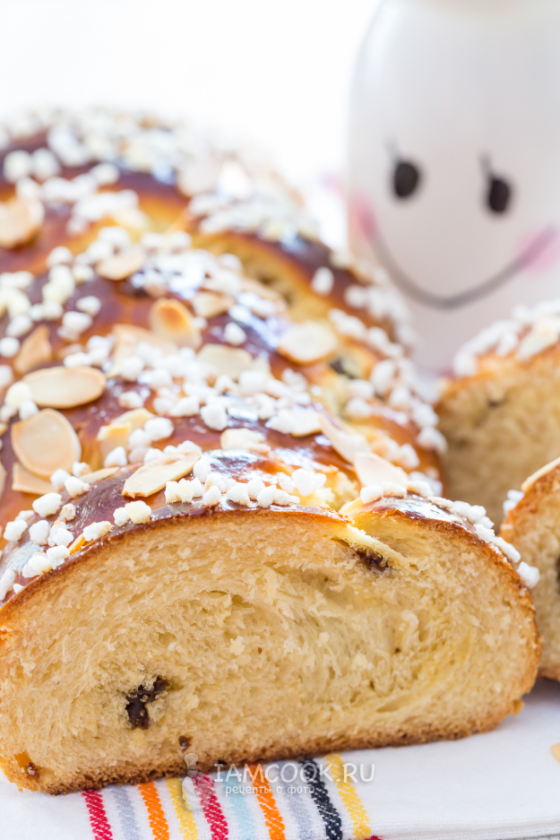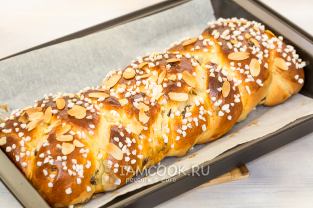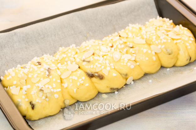 Спустя отведенное время смажьте заготовку взбитым яйцом и присыпьте миндальными лепестками и жемчужным сахаром.