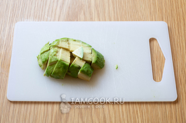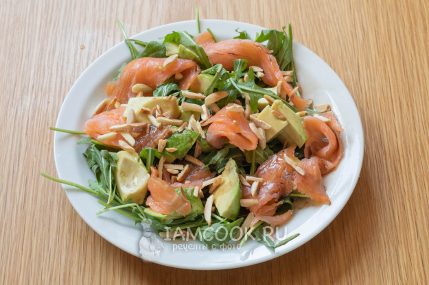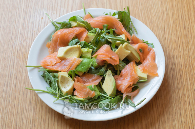 Поверх рукколы выложить авокадо и кусочки красной рыбы (я рву руками из готовой нарезки).