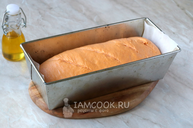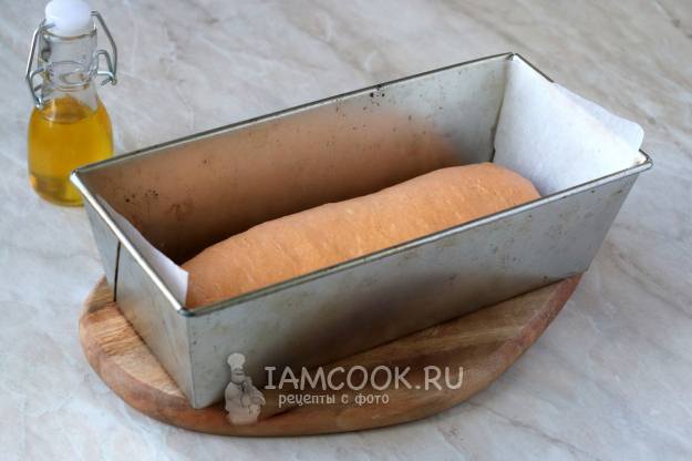 Накройте форму полотенцем и оставьте ещё на 20-30 минут для подхода. Затем с помощью острого ножа на поверхности теста сделайте косые надрезы (как показано на фото).