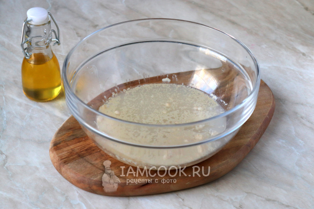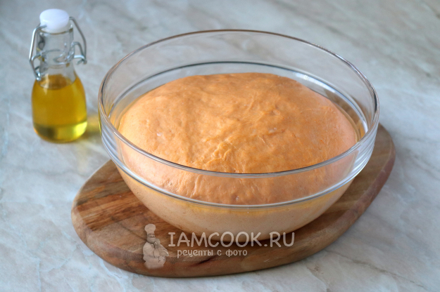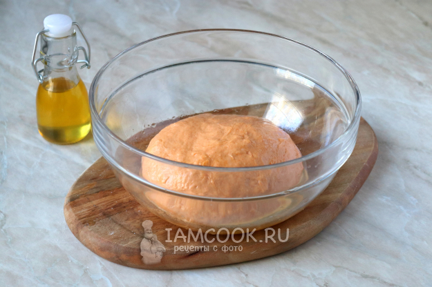 Замешанное тесто округлите и выложите в миску, смазанную тонким слоем растительного масла. Накройте ёмкость с тестом кухонным полотенцем и оставьте в тёплом месте на 1 час.