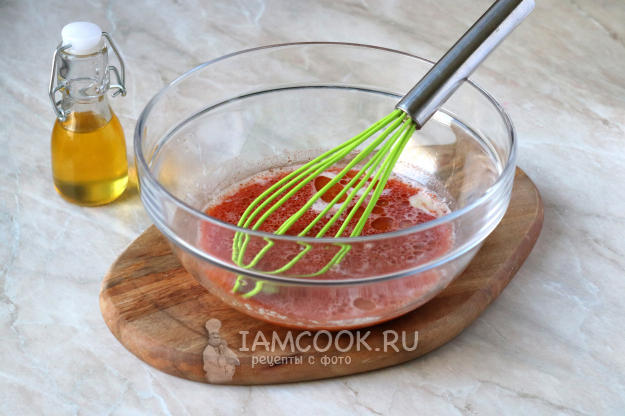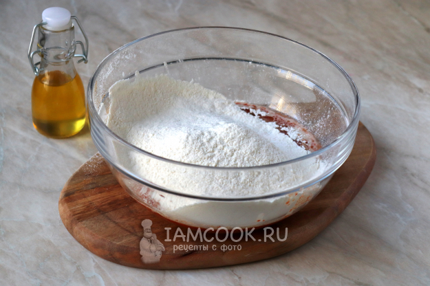 В получившуюся опару влейте растительное масло, добавьте соль и молотую паприку. Тщательно перемешайте.