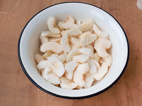 Очищаем яблоки от кожицы и семечек, режем их крупными ломтиками.