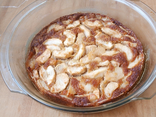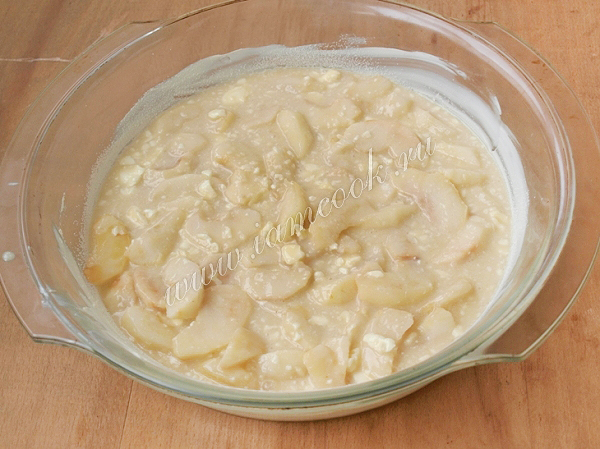 Смазываем форму сливочным маслом, посыпаем манной крупой или сухарями, выкладываем обжаренные яблоки и заливаем жидкой массой.