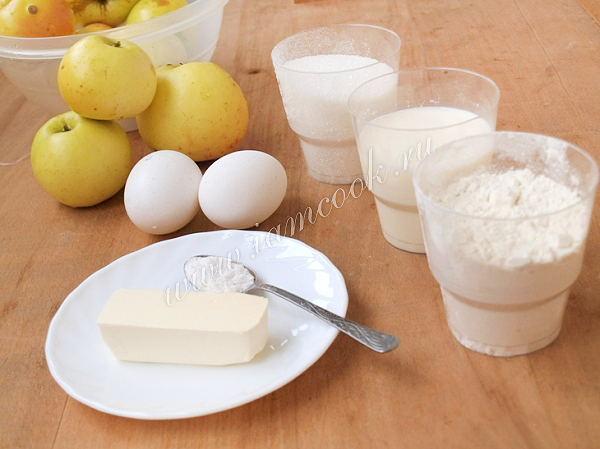 Для приготовления яблочного пудинга нам понадобятся яблоки, яйца, молоко, сахар, мука, сливочное масло, соль и сода.