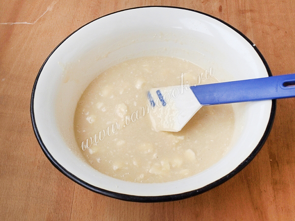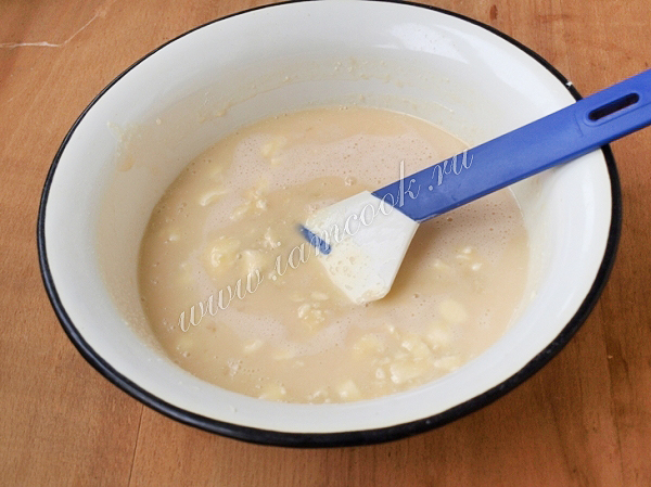 Отдельно взбиваем яйца, вводим их в общую массу и хорошо перемешиваем.
