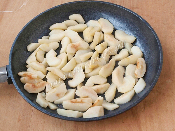 Разогреваем в сковороде сливочное масло и обжариваем яблоки до мягкости.