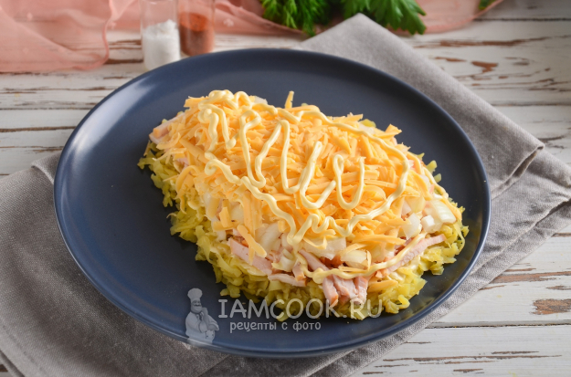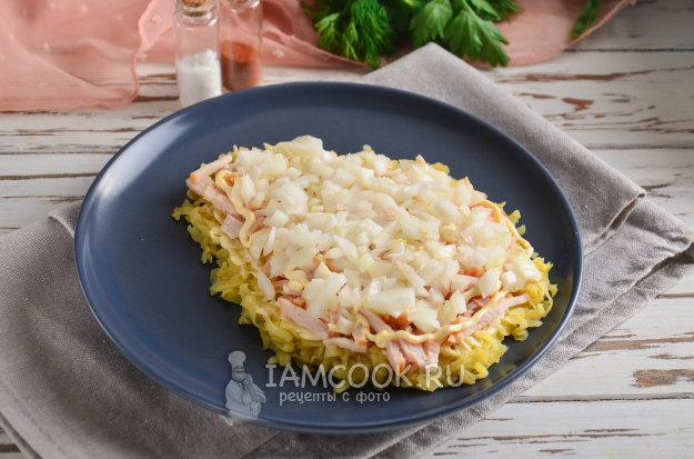 Отжатый от лишней жидкости маринованный лук нужно выложить поверх копченой курицы. Майонезом можно не смазывать.