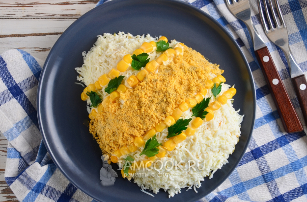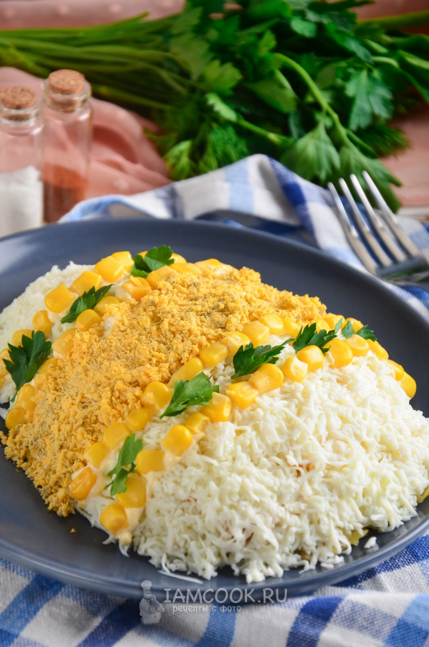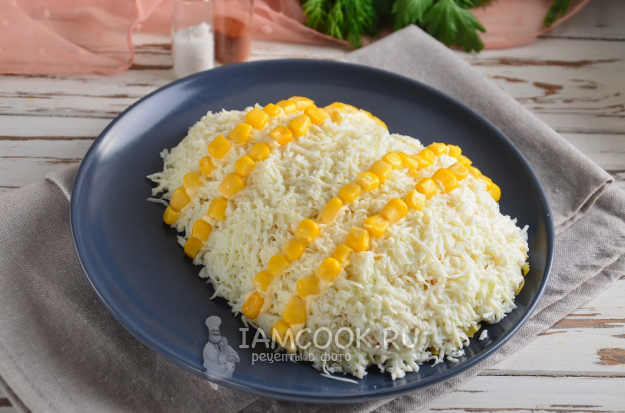 Вареные яйца разделите на белки и желтки, натрите на мелкой терке в разные тарелки. Сначала выложите тертые белки сплошным слоем и разровняйте. Далее выложите полоски из консервированной кукурузы.