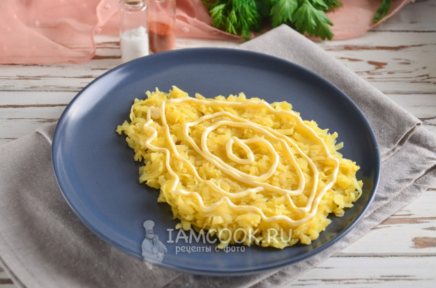 На плоское блюдо первым слоем нужно выложить тертый картофель. Натирать можно на крупной или мелкой терке. Слой нужно смазать майонезом.