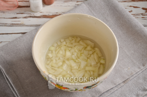 Нужно замариновать репчатый лук. Нарезать его лучше кубиками. После овощ нужно положить в пиалу, влить 50 мл воды и столовый уксус, а также добавить сахар. Маринад нужно перемешать, и оставить лук на 15 минут. Через четверть часа нужно слить маринад, немного промыть и отжать лук.
