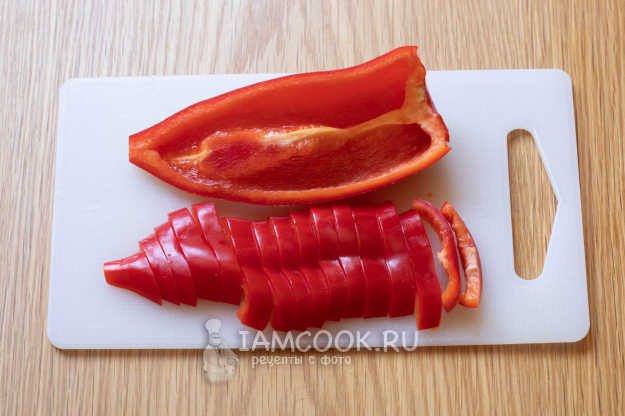 У перца следует удалить плодоножку, семена и белые перепонки, а потом нарезать его соломкой.