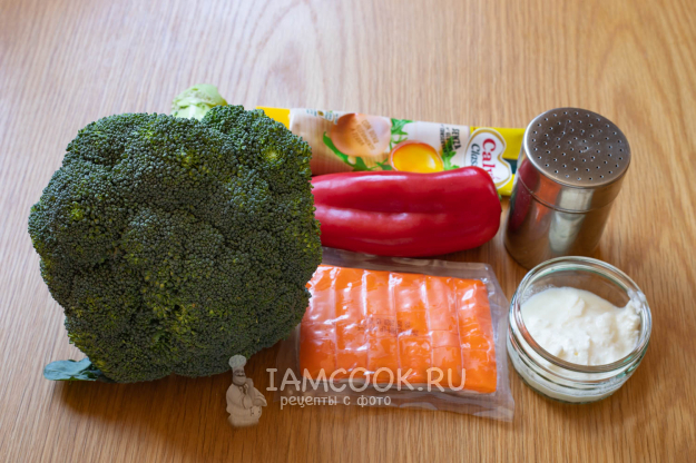 Подготовьте ингредиенты для салата с брокколи, крабовыми палочками и болгарским перцем.