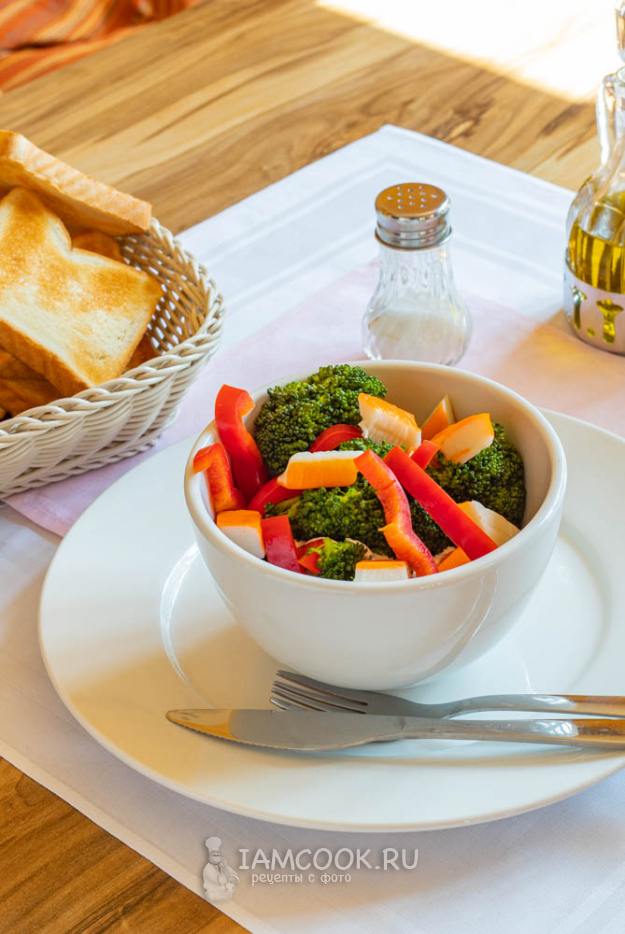 Сразу после того как брокколи будет готова, с неё следует слить воду и соединить с остальными ингредиентами салата. В принципе, если хочется сделать красивую и яркую разноцветную сервировку, то можно подать салат с брокколи, крабовыми палочками и болгарским перцем следующим образом, гости потом сами размешают.