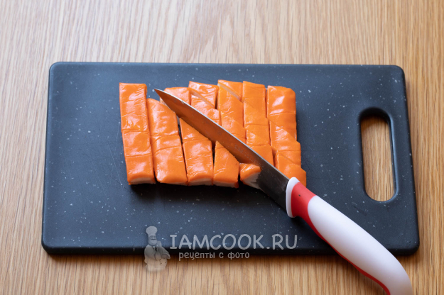 Пока варится брокколи, производится нарезка крабовых палочек.