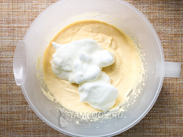 Добавьте половину сахара к белкам и взбейте до плотной пены.