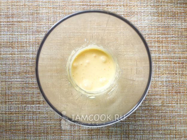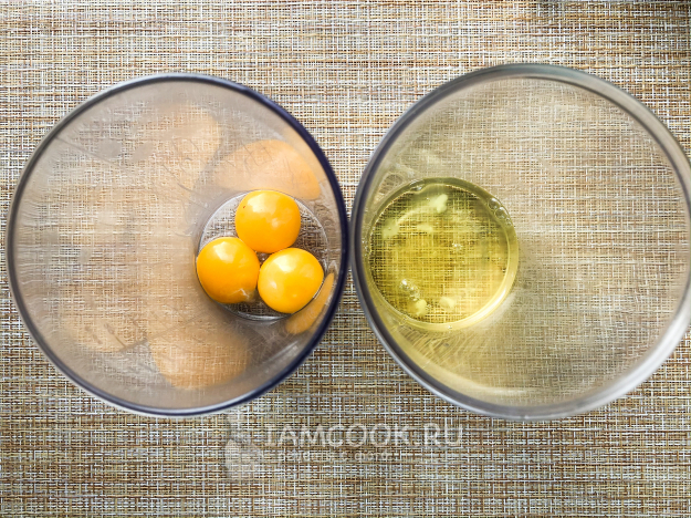 Вторую половину сахара добавьте к желткам и взбейте до побеления массы.