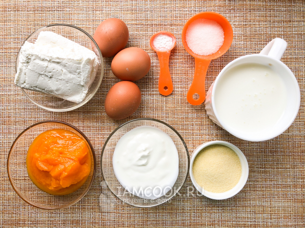 Для приготовления манника с творогом и тыквой на кефире возьмите следующие ингредиенты.