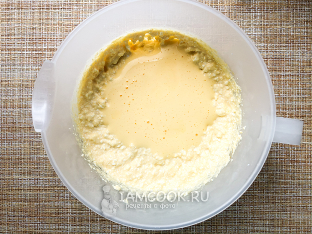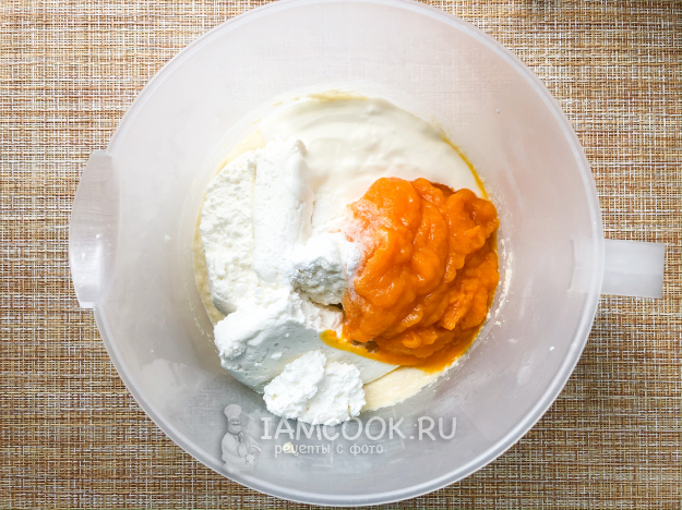 К кефиру с манкой добавьте творог, сметану, разрыхлитель и тыквенное пюре. Тщательно взбейте миксером.