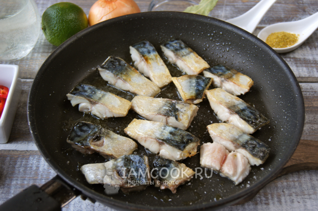 Залейте маринадом обжаренные кусочки рыбы, полностью остудите, уберите в холодильник на 7-10 часов.