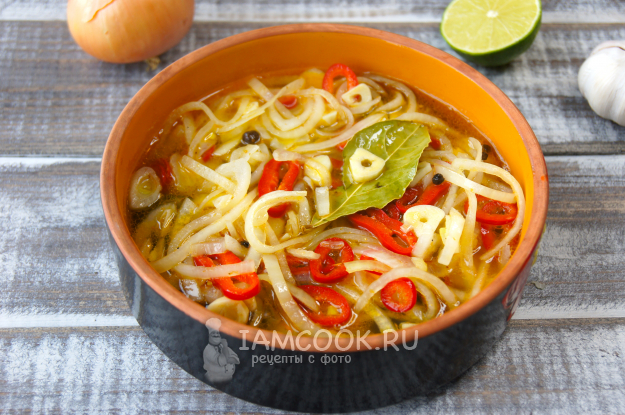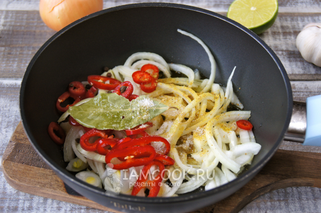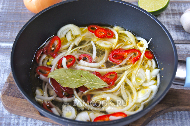 Добавьте перец чили, нарезанный на колечки, лавровый лист, перец, специи, сок лайма или лимона, соль и сахар.