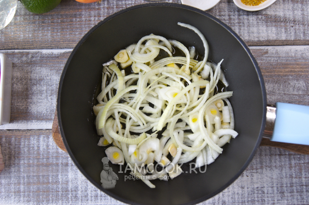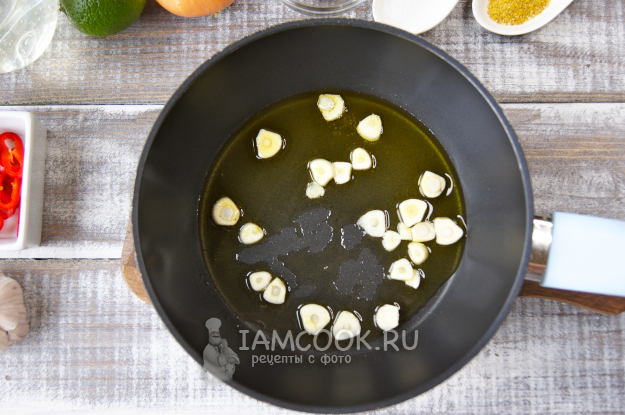 В сотейнике или сковороде разогрейте оливковое масло, выложите крупно нарезанный чеснок и слегка прогрейте.
