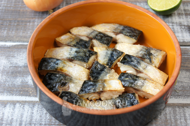 Разогрейте сковороду с оливковым маслом, выложите кусочки скумбрии кожей вниз.